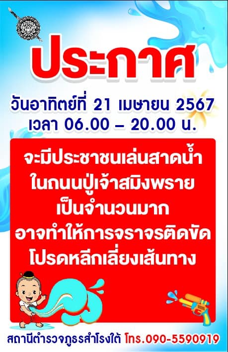 ห้ามรถยนต์ทุกชนิดบรรทุกหรืออุปกรณ์บรรทุกนำ้พร้อมคนเพื่อสาดนำ้ เดินรถ หรือจอดรถและห้ามนำรถติดตั้งเครื่องขยายเสียงมาใช้และห้ามจอดรถกีดขวางการจราจร ในถนนปู่เจ้าสมิงพราย ตลอดสาย