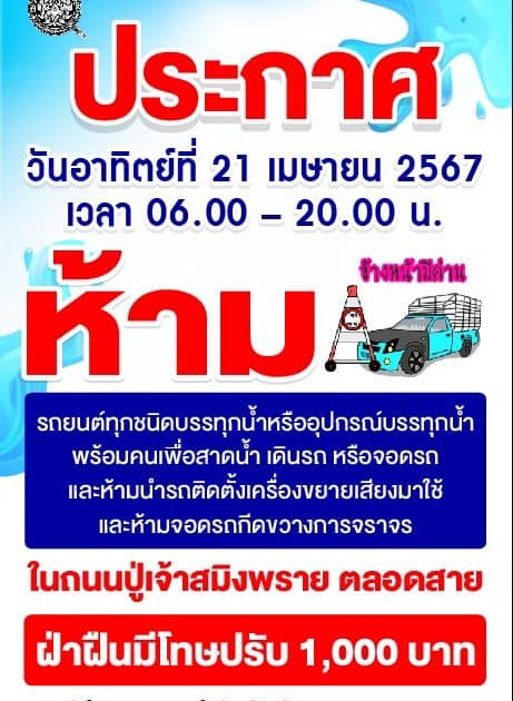 ห้ามรถยนต์ทุกชนิดบรรทุกหรืออุปกรณ์บรรทุกนำ้พร้อมคนเพื่อสาดนำ้ เดินรถ หรือจอดรถและห้ามนำรถติดตั้งเครื่องขยายเสียงมาใช้และห้ามจอดรถกีดขวางการจราจร ในถนนปู่เจ้าสมิงพราย ตลอดสาย